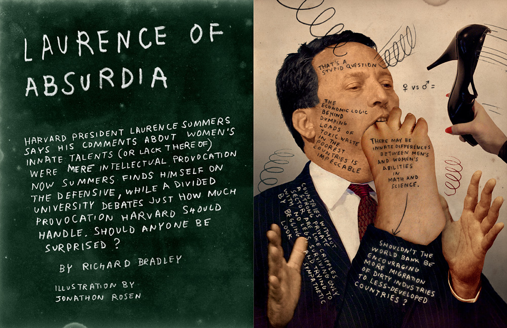 A spread for Boston Magazine about Mr. Lawrence Summers, the smooth-talking president of Harvard University.